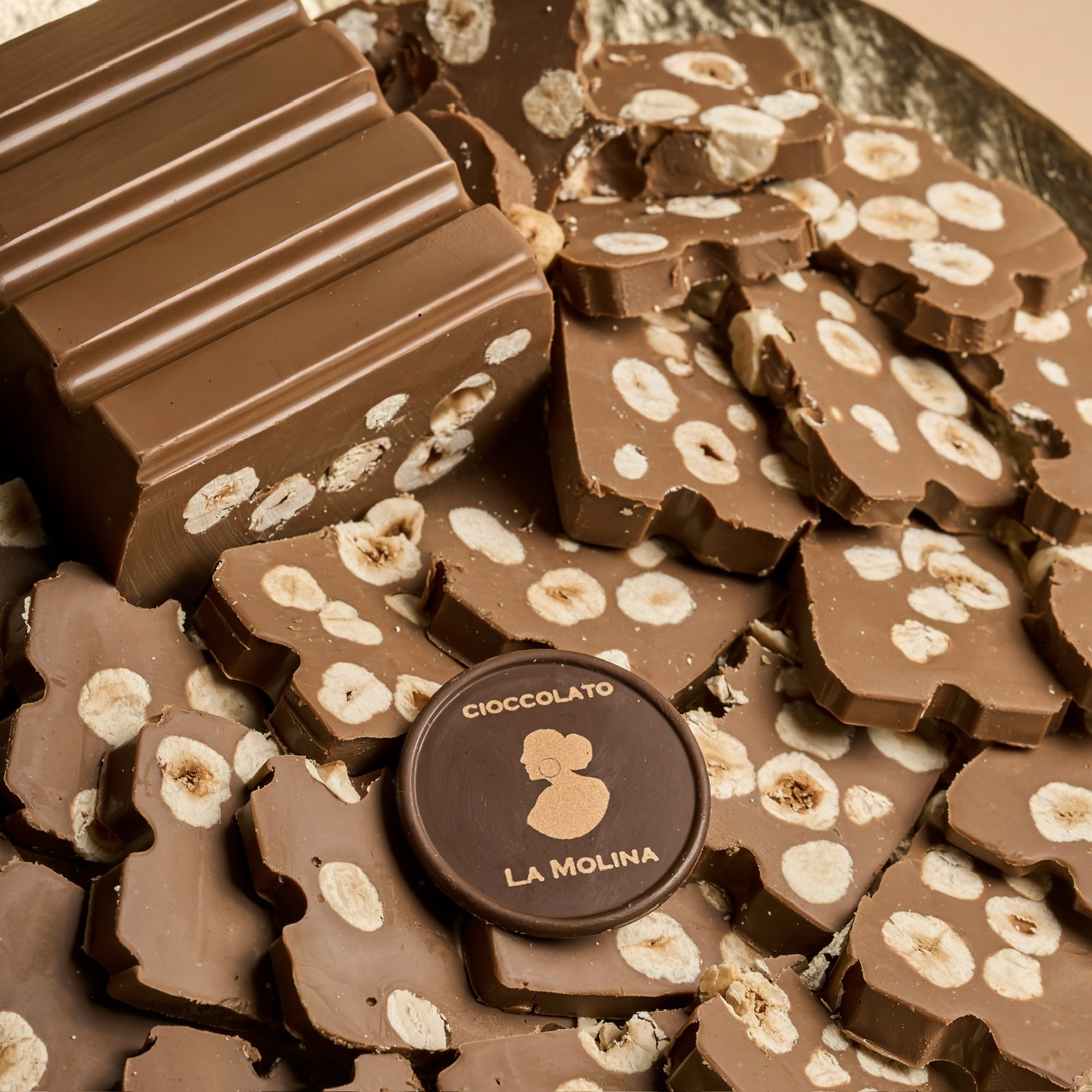 Milk gianduja with whole hazelnuts.